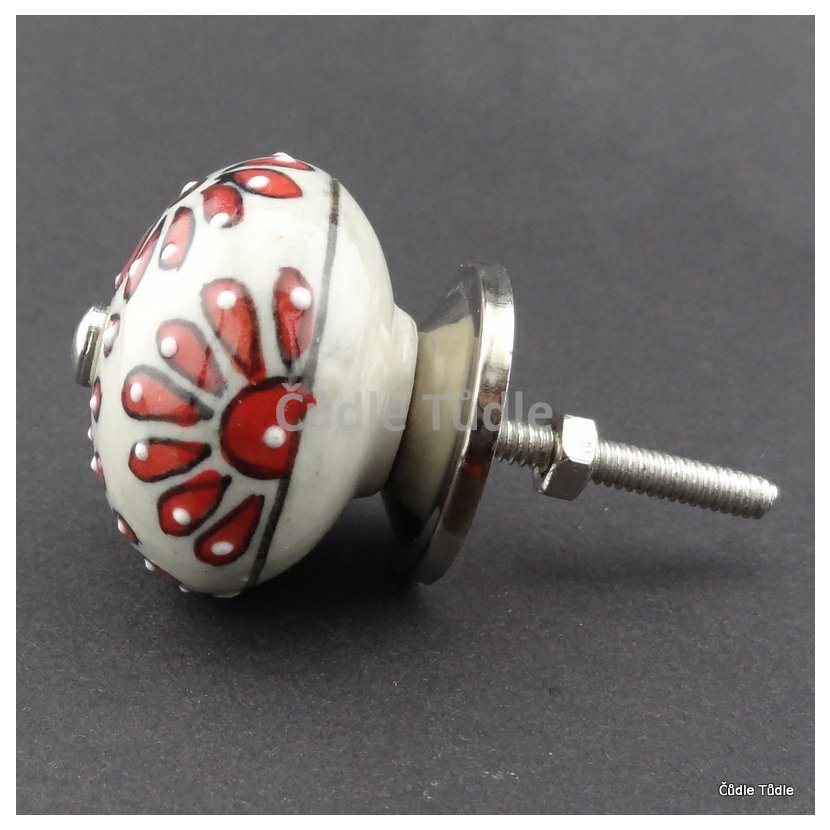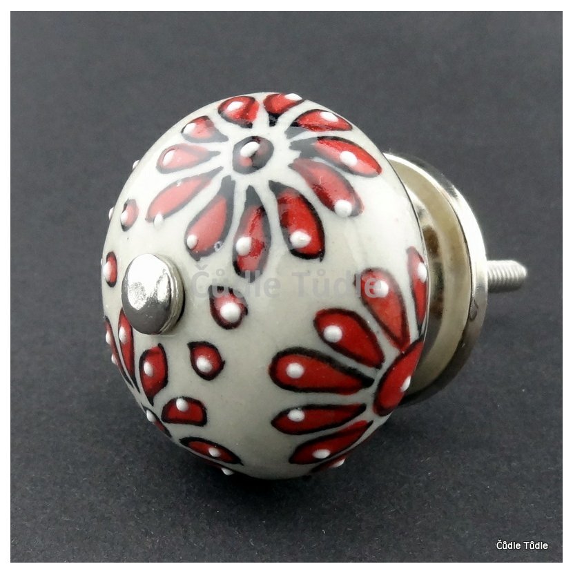 Ručně malovaná keramická nábytková úchytka- knopka s reliéfní červenou kresbou na krémovém podkladu