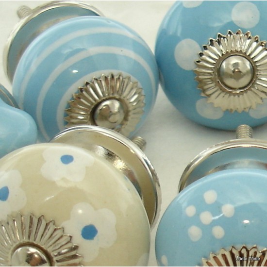 Kombinace 10 keramických nábytkových úchytek-knopek v bílé, krémové a světle modré barvě.