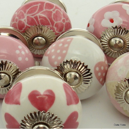 Kombinace 10 keramických nábytkových úchytek, knopek v růžovobílé barvě.