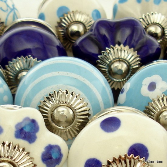 Kombinace 20 keramických nábytkových úchytek - knopek v bílé a modré barvě.