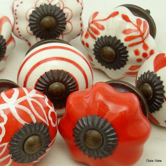 Kombinace 8 keramických nábytkových úchytek-knopek v červené a bílé barvě.