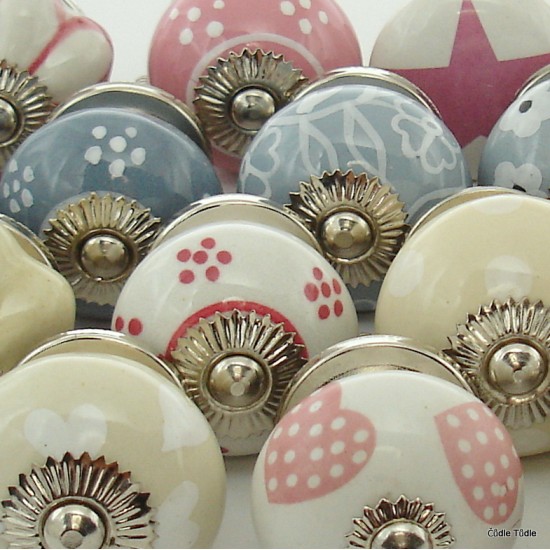 Kombinace 20 keramických nábytkových úchytek - knopek v růžové, bílé,šedé a krémové barvě.