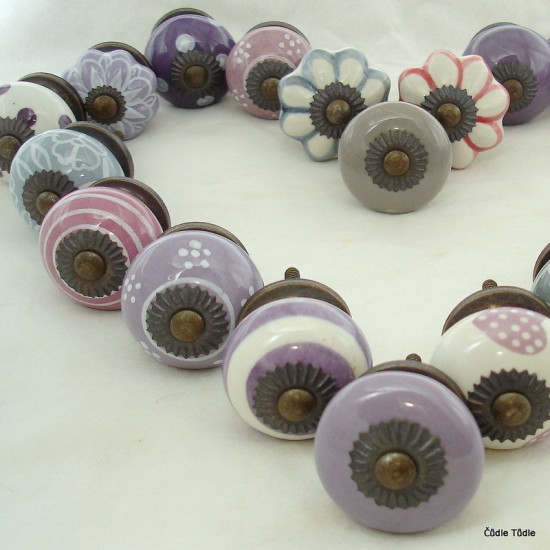 Kombinace 20 keramických nábytkových úchytek-knopek v bílé, fialové a šedé barvě.