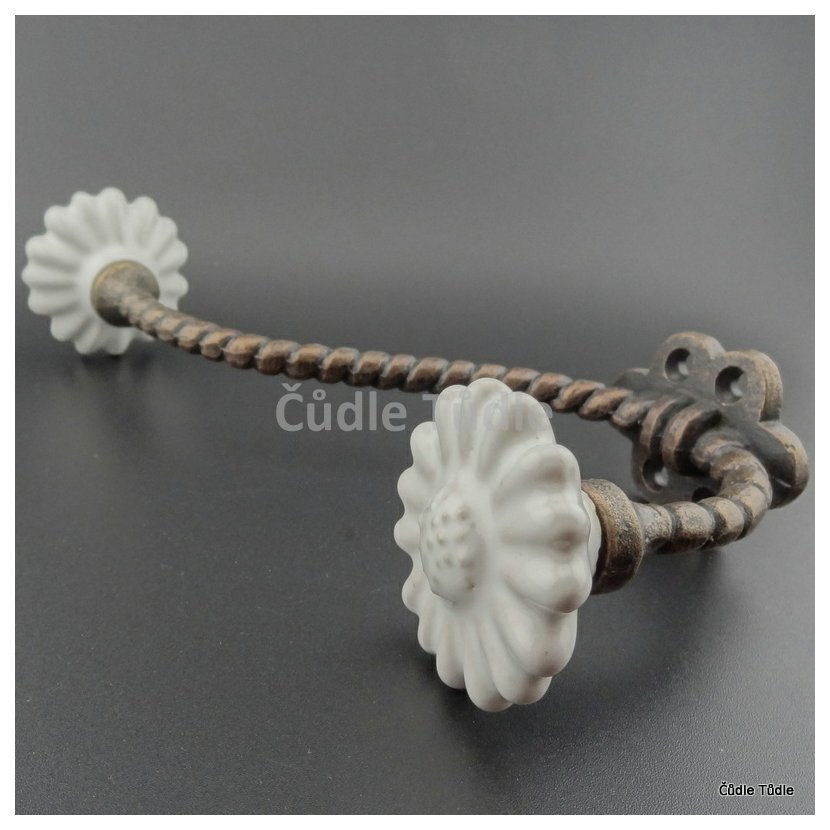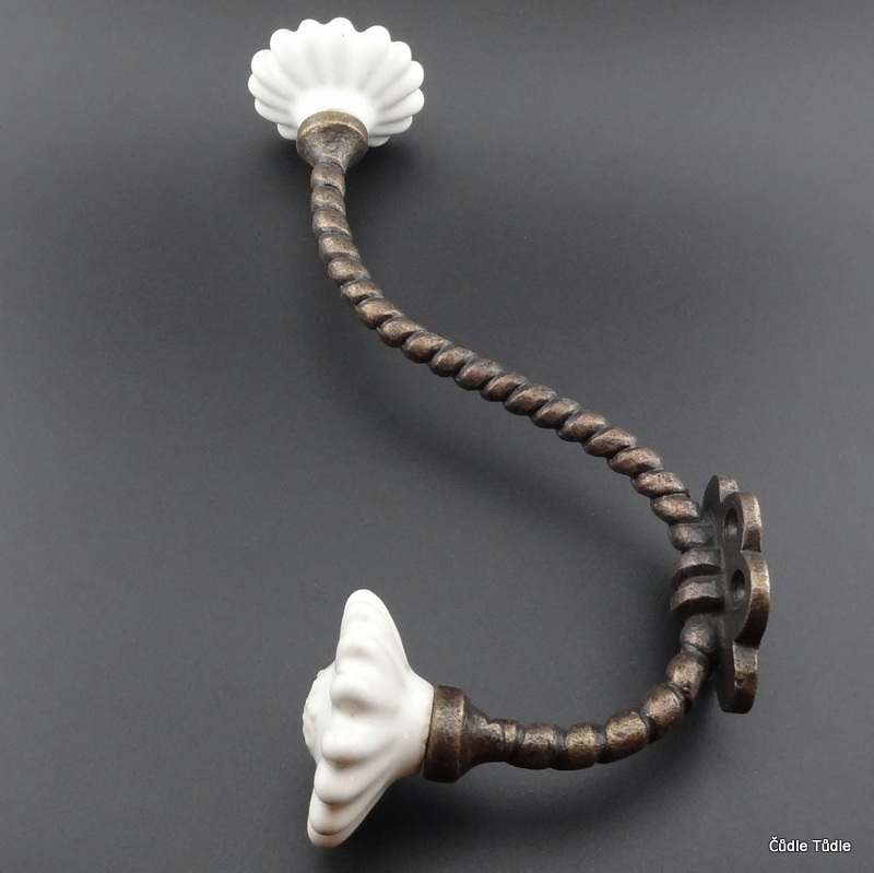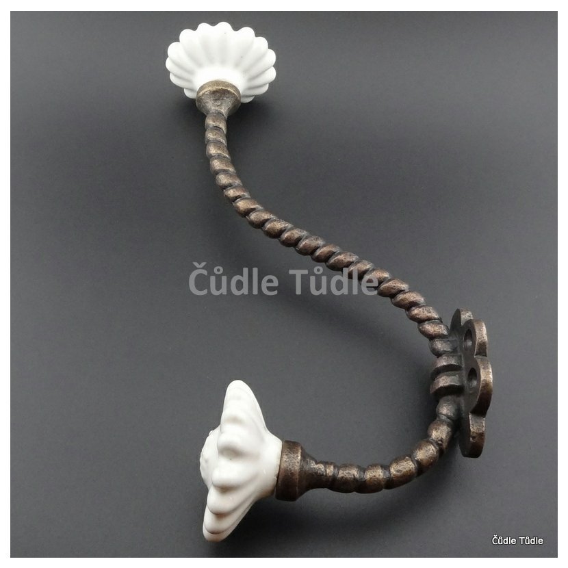 - Litinový věšák s bílými keramickými ozdobami.