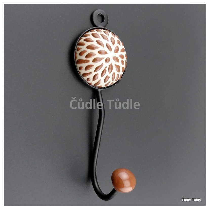 - Kovový věšák s hnědou keramickou ozdobou s reliéfní glazurou.