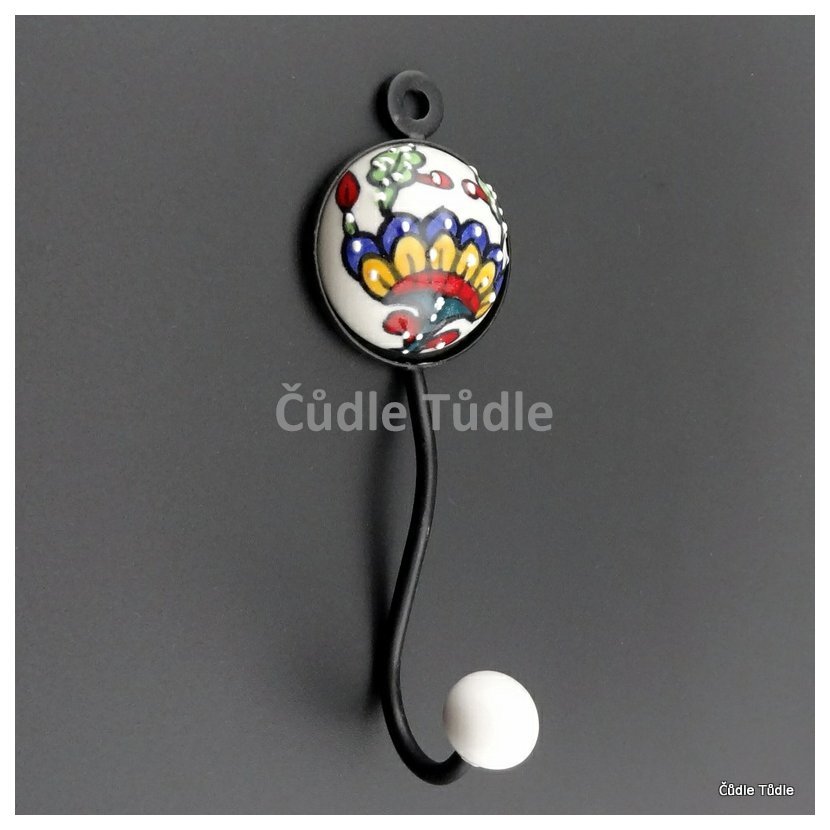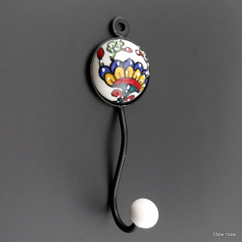 - Kovový věšák s pestrobarevnou keramickou ozdobou.