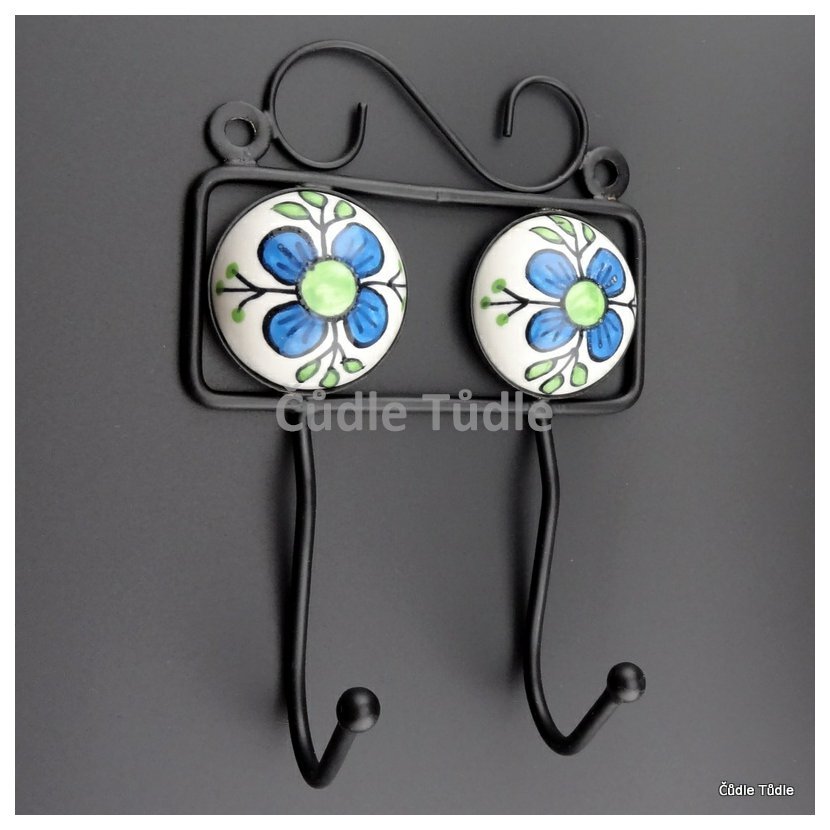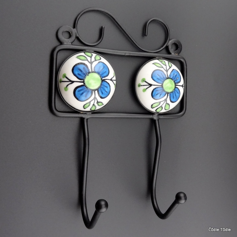 - Kovový věšák se dvěmi keramickými ozdobami s motivem květin.